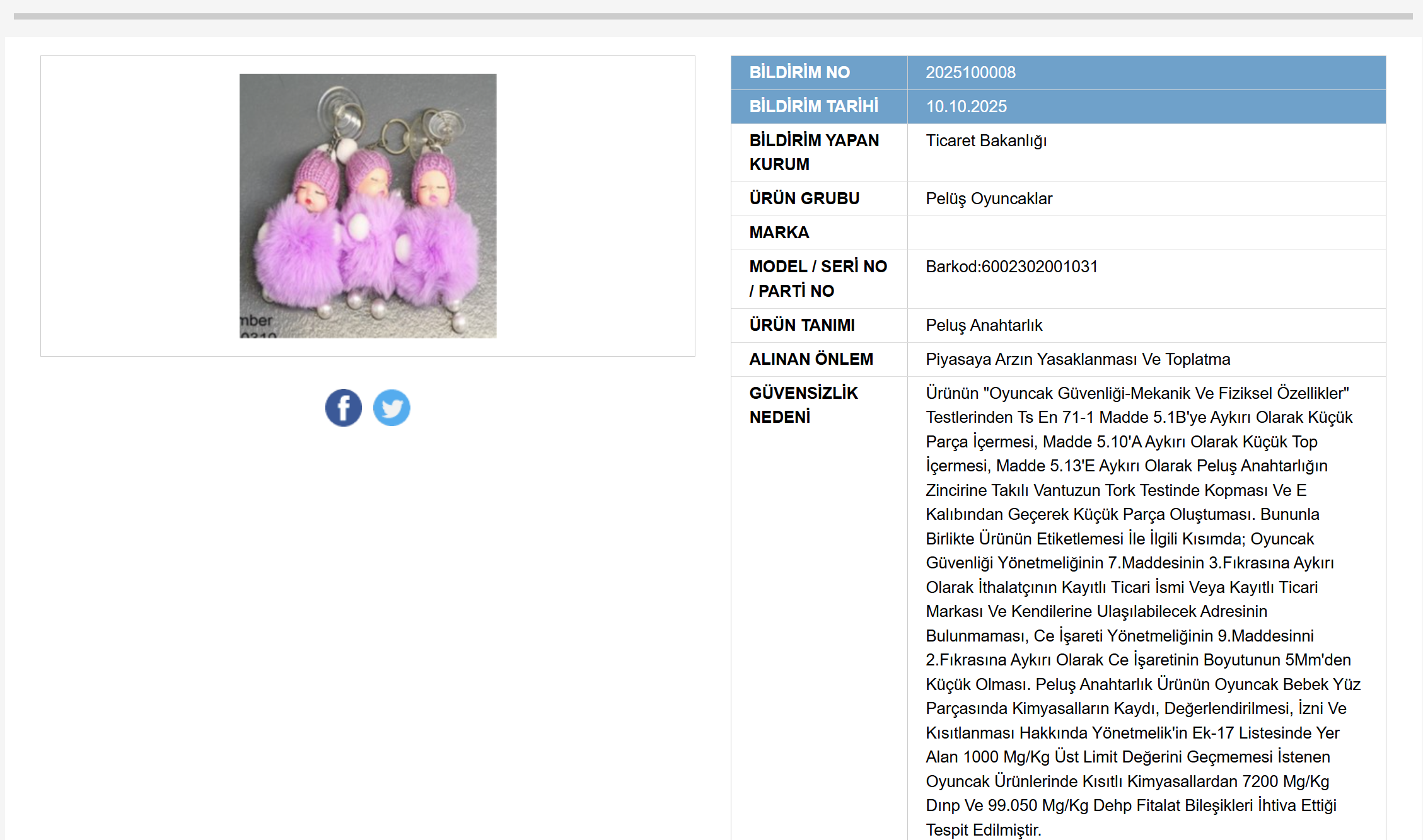Ticaret Bakanlığı, Çin menşeli “Peluş Anahtarlık” ürününde oyuncak güvenliği testlerinde ciddi uygunsuzluklar tespit edildiğini, ürünün piyasaya arzının yasaklandığını ve toplatma işlemi başlatıldığını duyurdu.