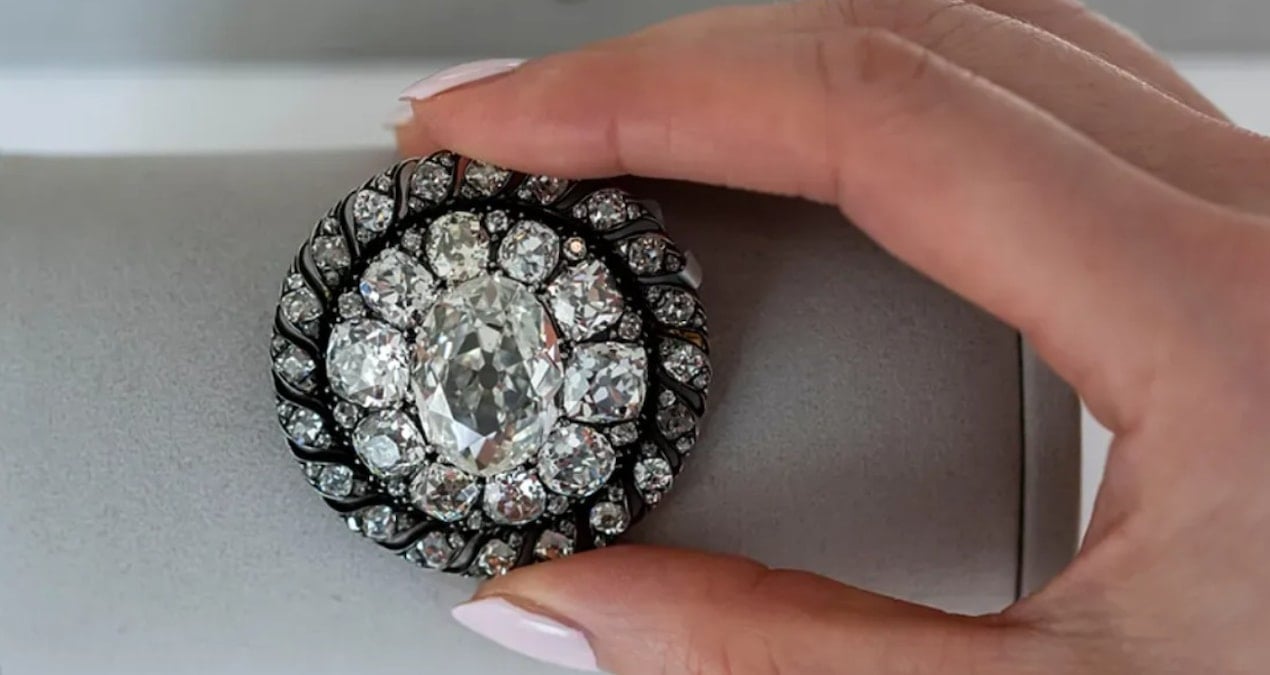 Tarihi mücevher, yalnızca broş olarak değil, aynı zamanda kolye ucu olarak da kullanılabiliyor. Merkezinde 13 karattan fazla ağırlığa sahip oval bir pırlanta yer alırken, etrafı daha küçük kesimli pırlantalarla çevrili. El işçiliğiyle üretilmiş bu zarif tasarım, görsel ihtişamının ötesinde tarihi bir değer de taşıyor.